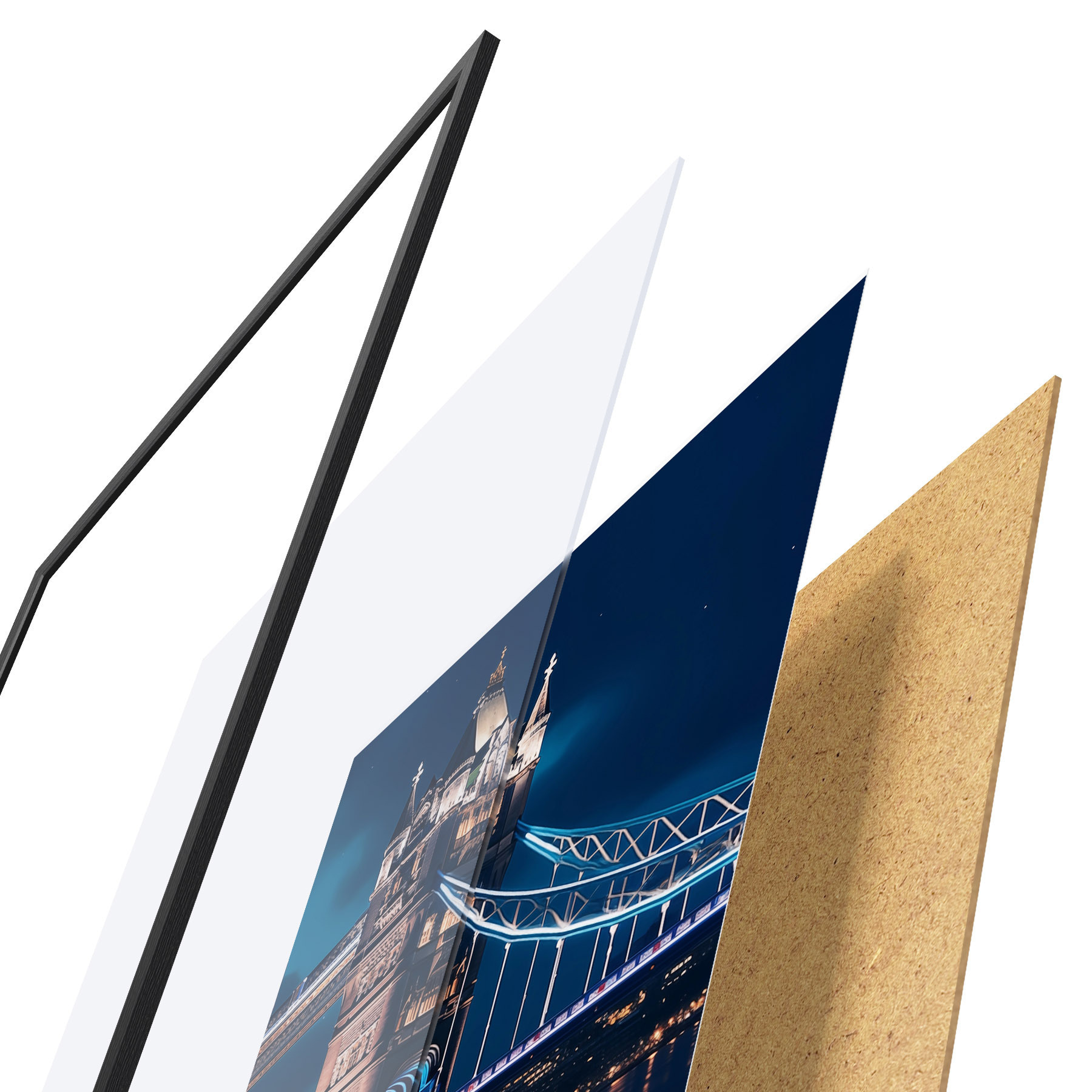 Plakatą sudaro rėmas, pleksiklas, atspausdintas vaizdas ir medžio drožlių plokštės pagrindas. Plakatą galima iš karto pakabinti ant sienos dėl kitoje pusėje esančių laikiklių.