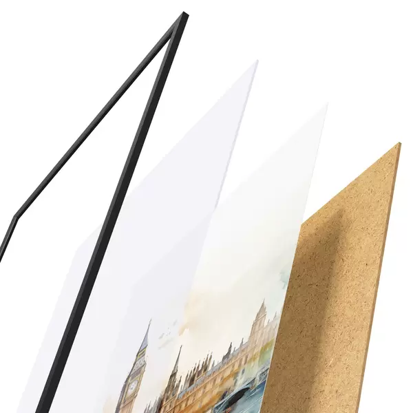 Plakatą sudaro rėmas, pleksiklas, atspausdintas vaizdas ir medžio drožlių plokštės pagrindas. Plakatą galima iš karto pakabinti ant sienos dėl kitoje pusėje esančių laikiklių.