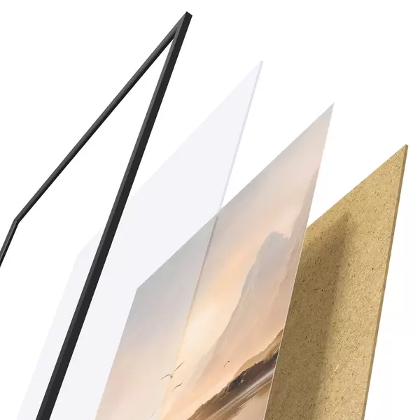 Plakatą sudaro rėmas, pleksiklas, atspausdintas vaizdas ir medžio drožlių plokštės pagrindas. Plakatą galima iš karto pakabinti ant sienos dėl kitoje pusėje esančių laikiklių.