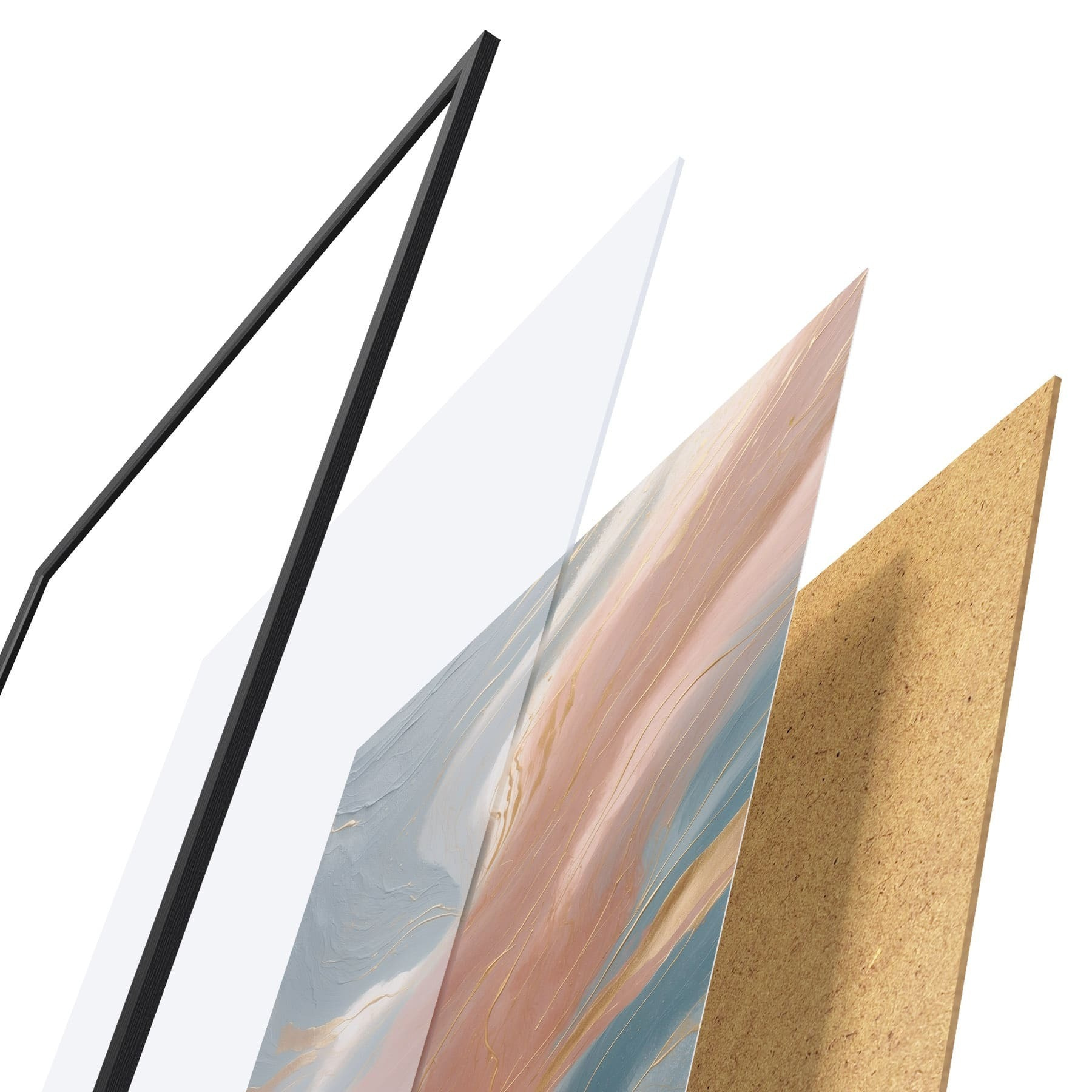 Plakatą sudaro rėmas, pleksiklas, atspausdintas vaizdas ir medžio drožlių plokštės pagrindas. Plakatą galima iš karto pakabinti ant sienos dėl kitoje pusėje esančių laikiklių.