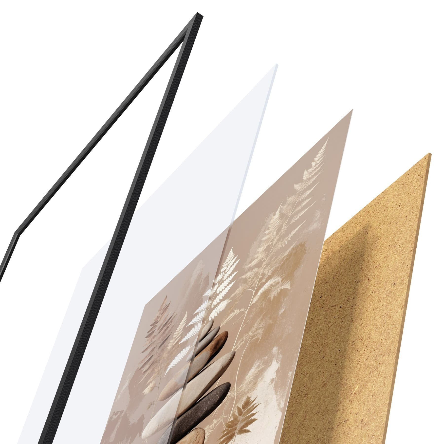 Plakatą sudaro rėmas, pleksiklas, atspausdintas vaizdas ir medžio drožlių plokštės pagrindas. Plakatą galima iš karto pakabinti ant sienos dėl kitoje pusėje esančių laikiklių.