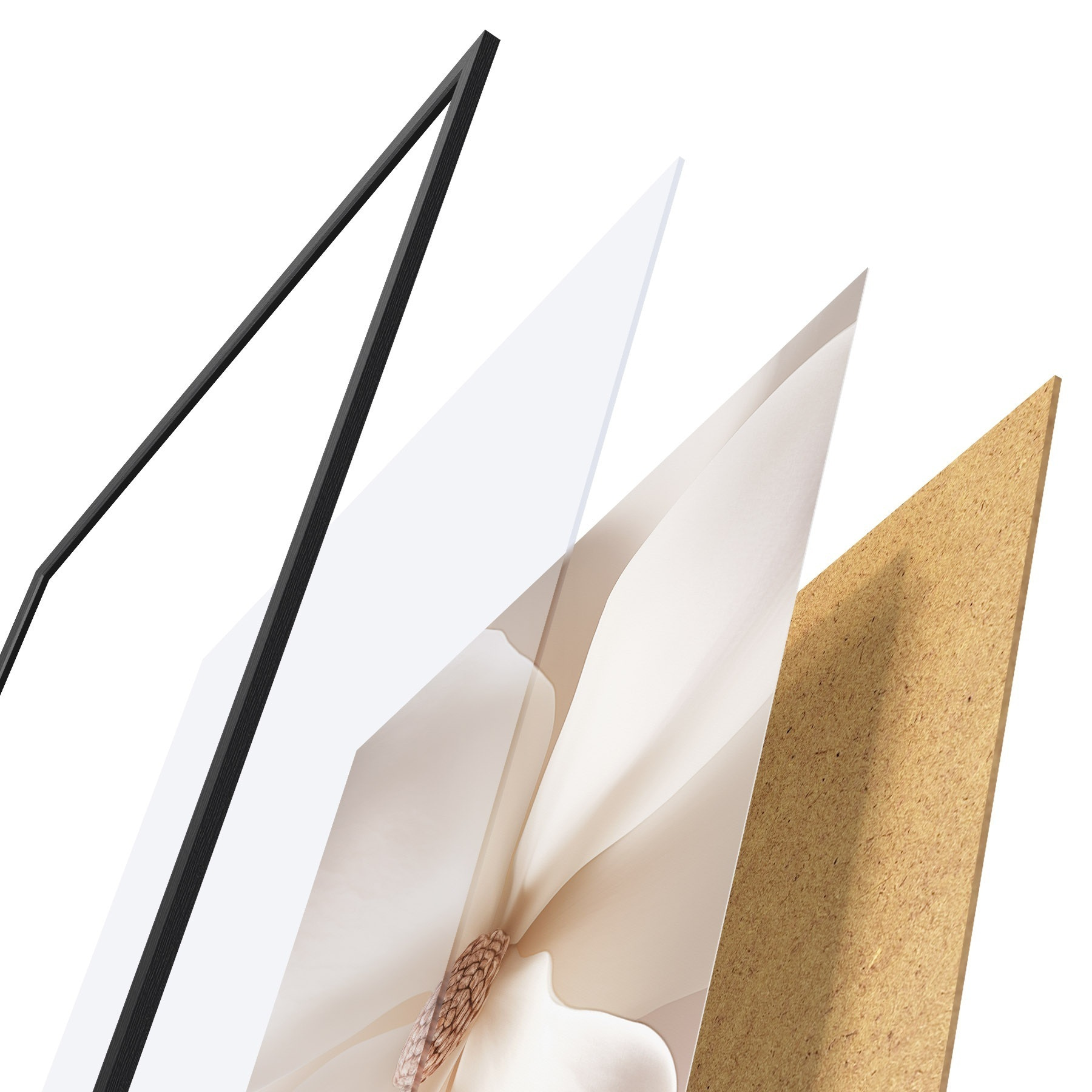 Plakatą sudaro rėmas, pleksiklas, atspausdintas vaizdas ir medžio drožlių plokštės pagrindas. Plakatą galima iš karto pakabinti ant sienos dėl kitoje pusėje esančių laikiklių.