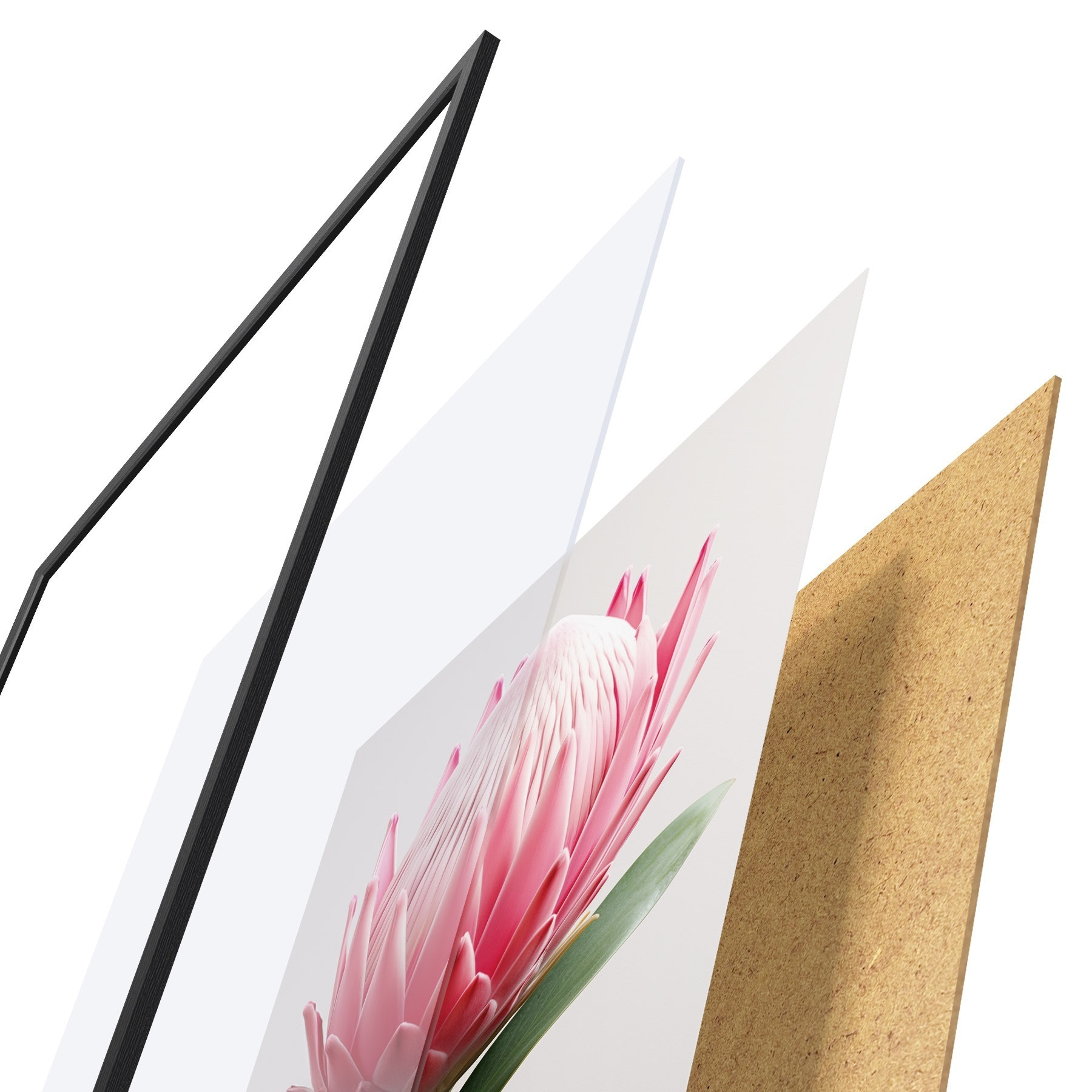 Plakatą sudaro rėmas, pleksiklas, atspausdintas vaizdas ir medžio drožlių plokštės pagrindas. Plakatą galima iš karto pakabinti ant sienos dėl kitoje pusėje esančių laikiklių.
