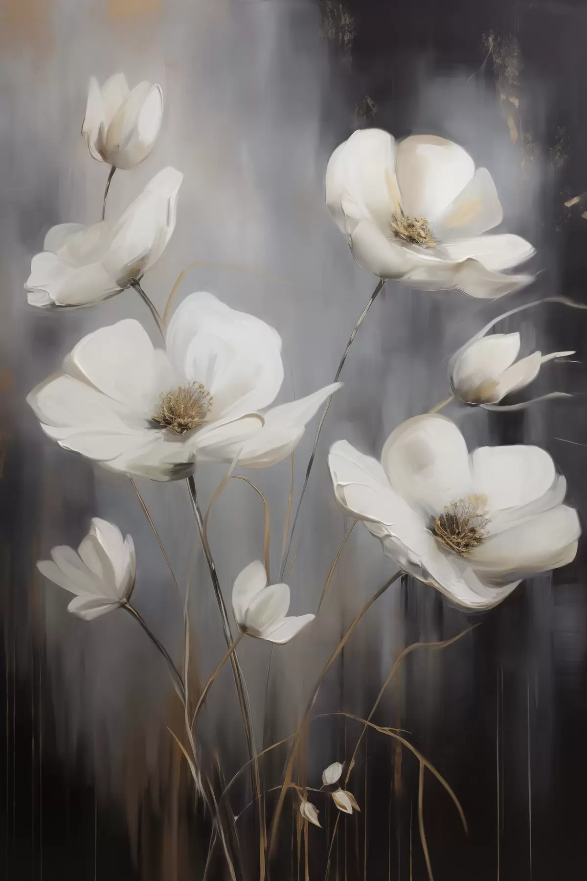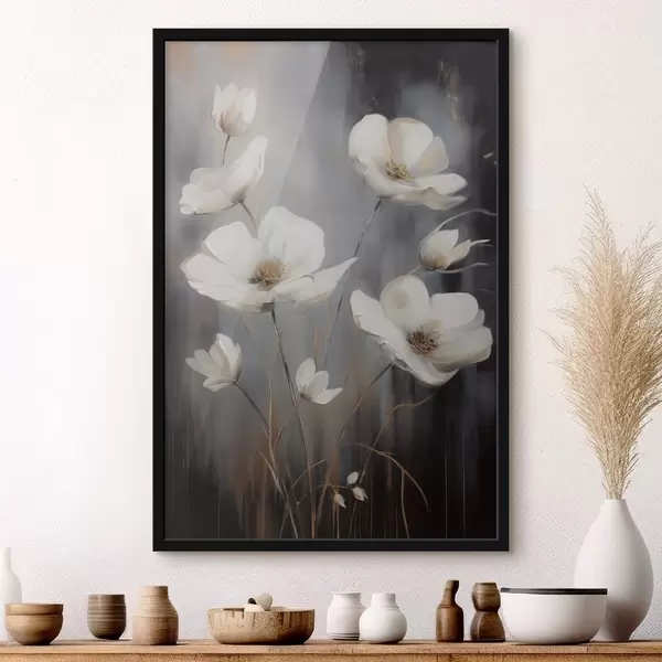 Plakatas Balta gėlė su rudu centru ir plonu stiebu ant tamsaus, tekstūruoto fono f47858