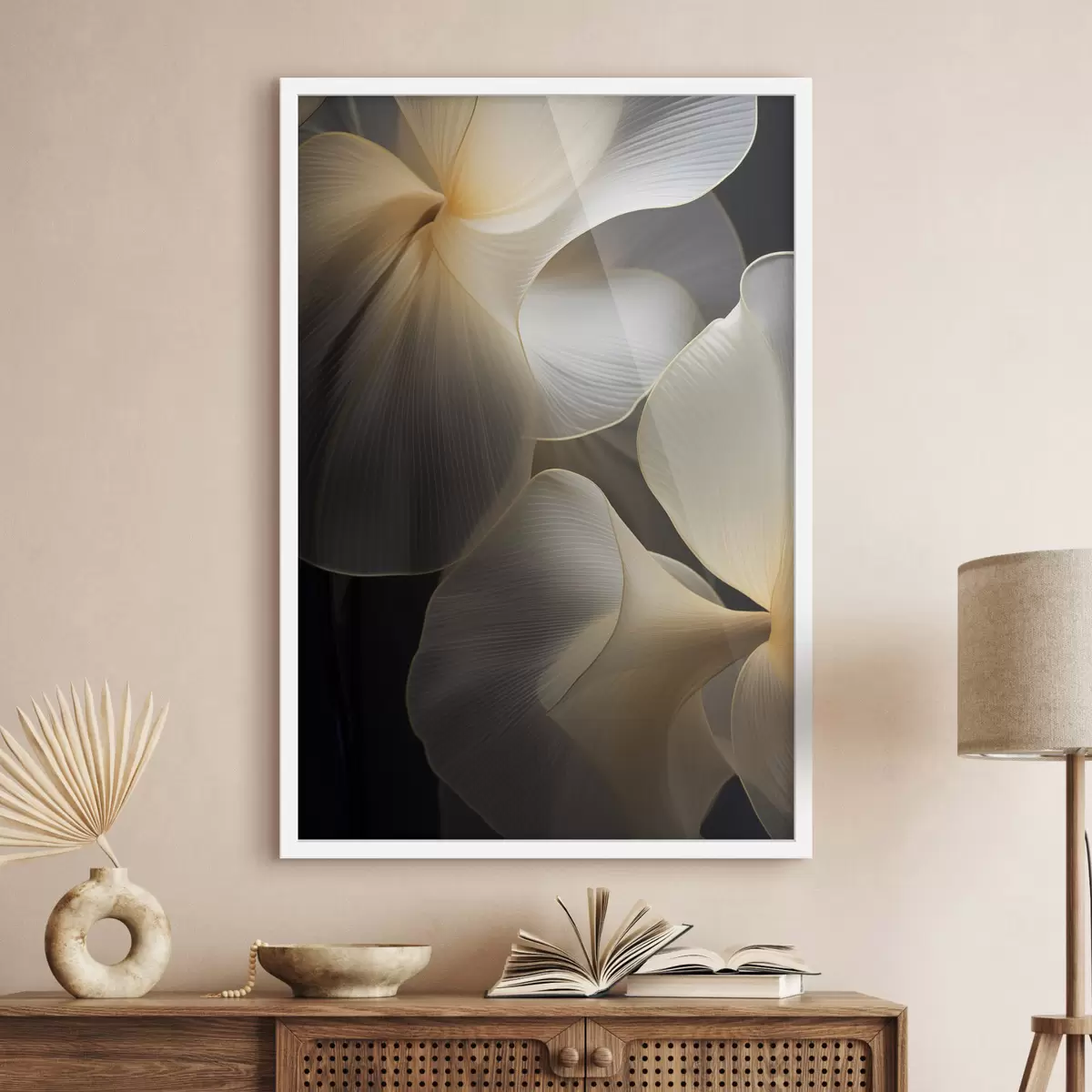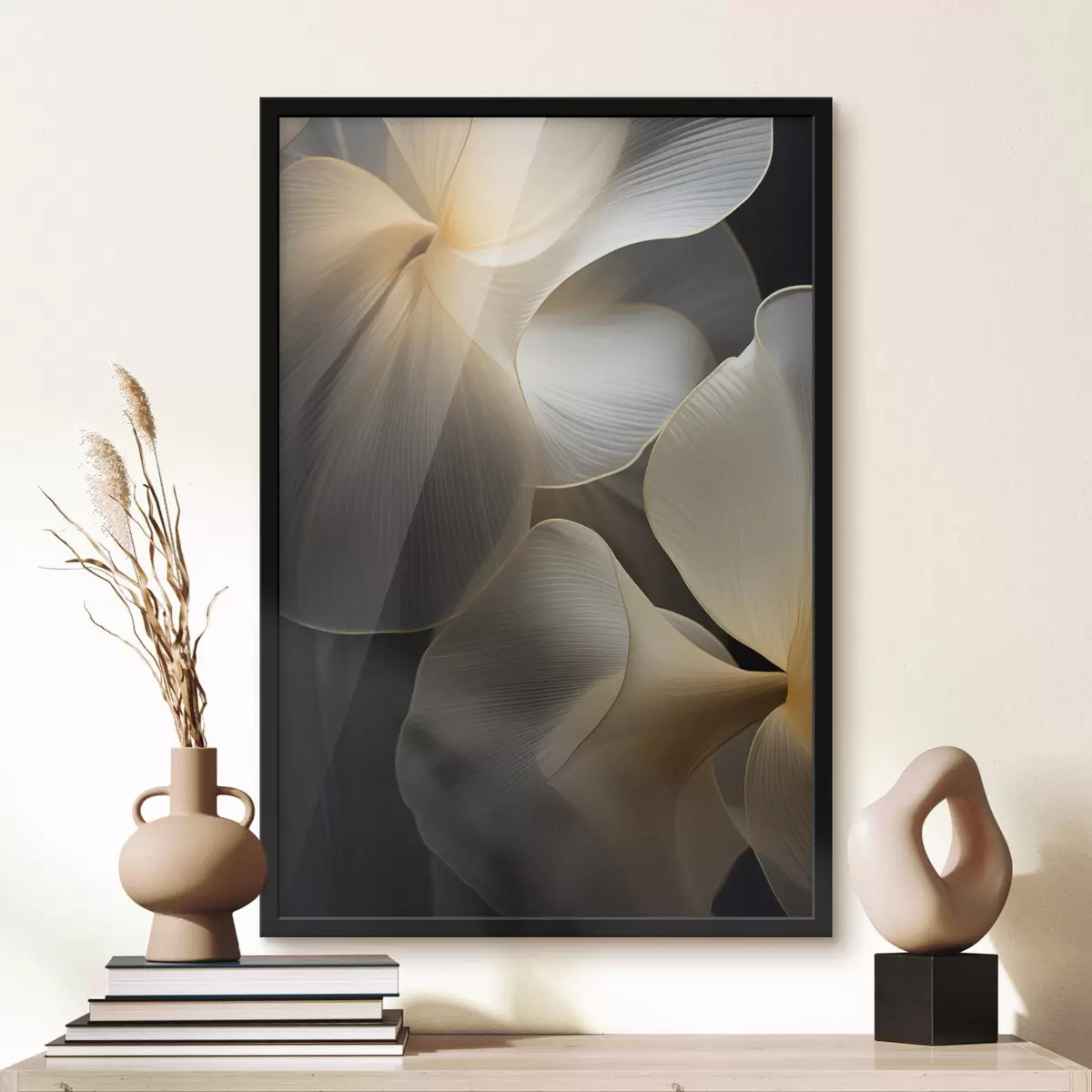 Plakatas Abstrakčios, permatomos žiedlapių formos figūros su subtiliais kontūrais, kontrastuojančios su tamsiu fonu. Ne f47859