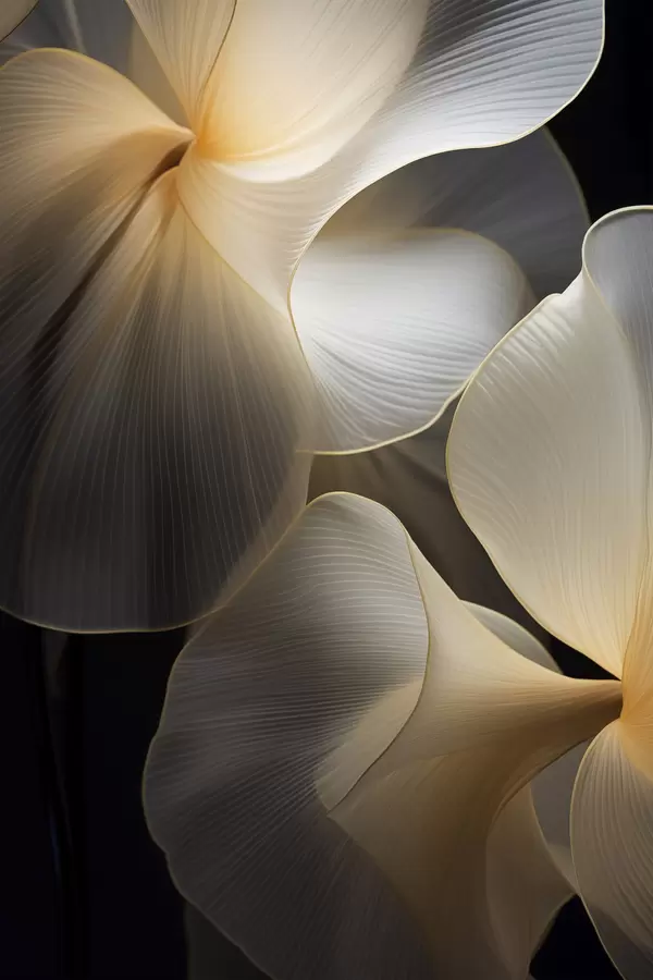 Plakatas Abstrakčios, permatomos žiedlapių formos figūros su subtiliais kontūrais, kontrastuojančios su tamsiu fonu. Ne f47859