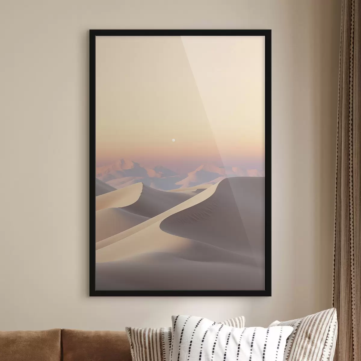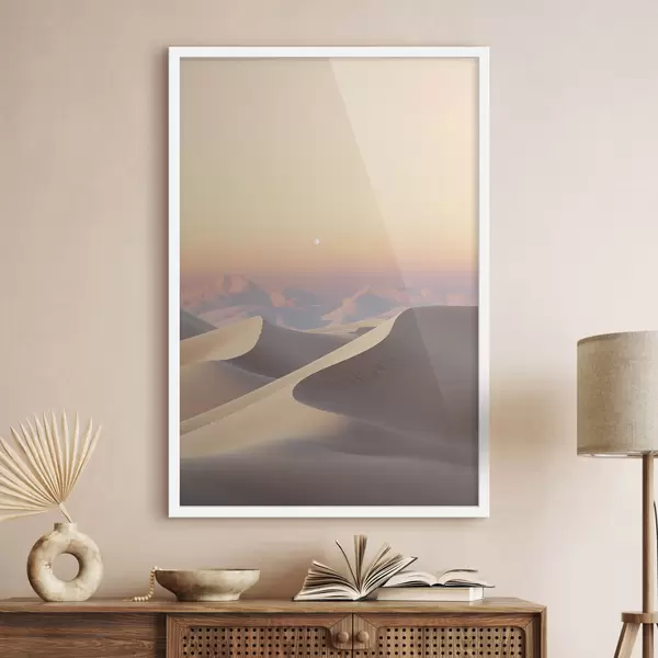 Plakatas Dykumos kraštovaizdis su banguojančiomis smėlio kopomis po švelniu pastelinės spalvos dangumi, tolumoje matomos kalvos Ne f47865