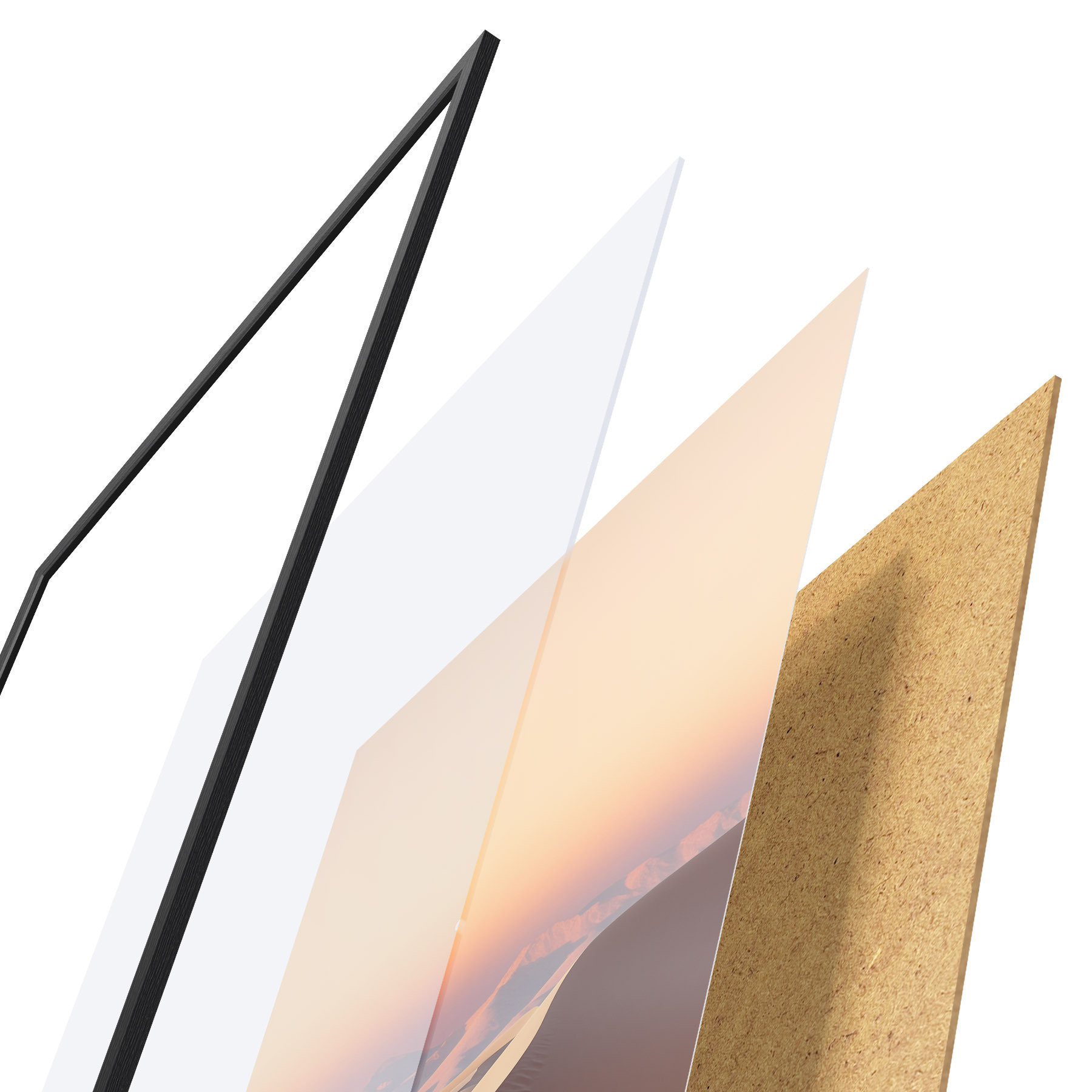 Plakatą sudaro rėmas, pleksiklas, atspausdintas vaizdas ir medžio drožlių plokštės pagrindas. Plakatą galima iš karto pakabinti ant sienos dėl kitoje pusėje esančių laikiklių.