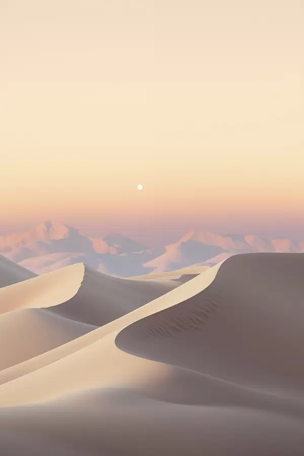 Plakatas Dykumos kraštovaizdis su banguojančiomis smėlio kopomis po švelniu pastelinės spalvos dangumi, tolumoje matomos kalvos Ne f47865