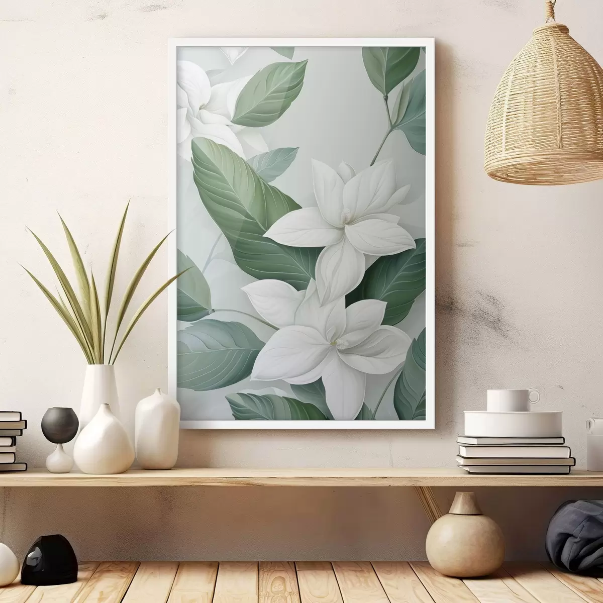 Plakatas Balta gėlė su žaliais lapais, pastelinis fonas Ne f47869