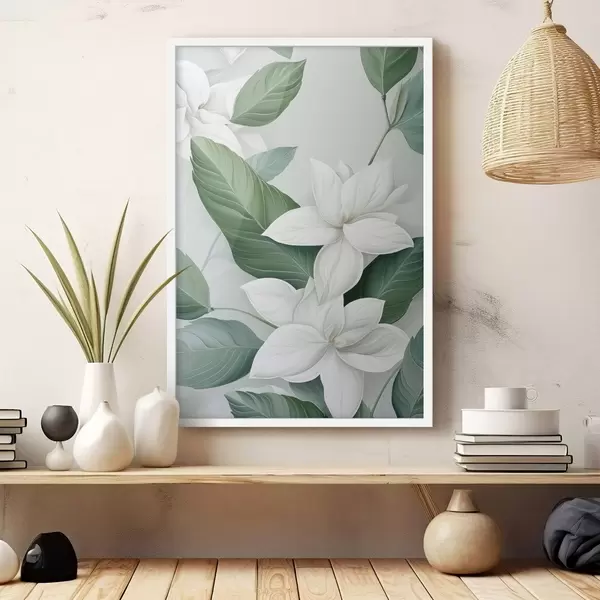 Plakatas Balta gėlė su žaliais lapais, pastelinis fonas f47869