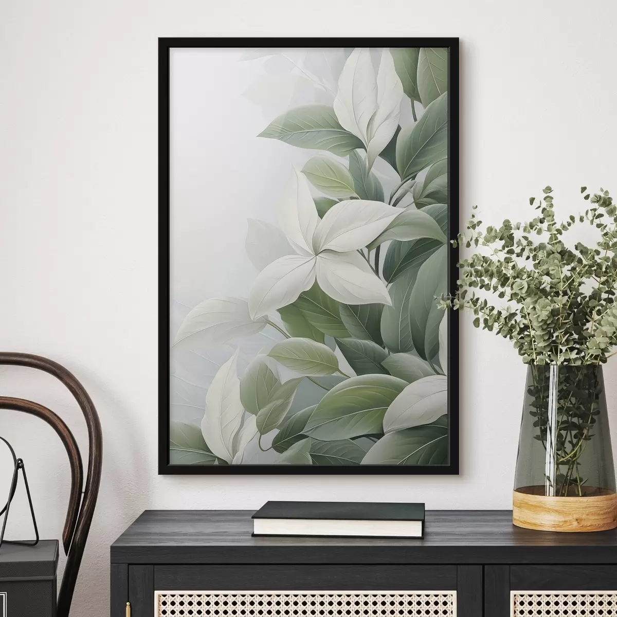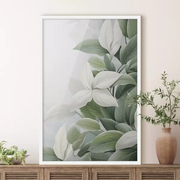 Plakatas Balta gėlė su žaliais lapais, pastelinis fonas f47870