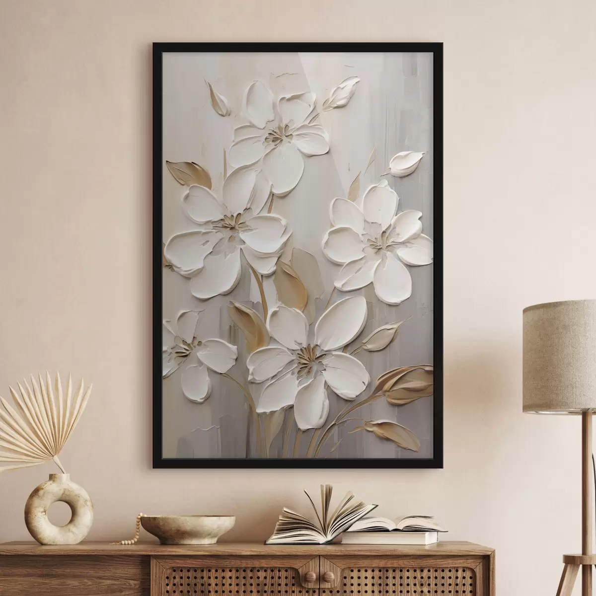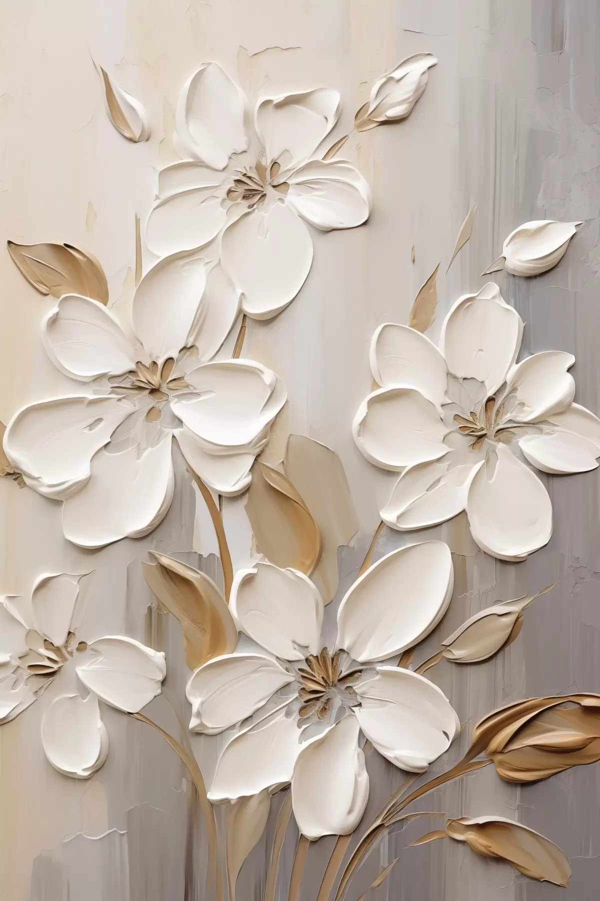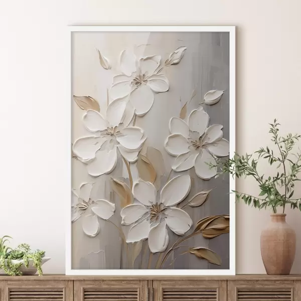 Plakatas Abstrakčios baltos gėlės su tekstūruotais žiedlapiais, neutraliame fone su subtiliais teptuko potėpiais. Ne f47874