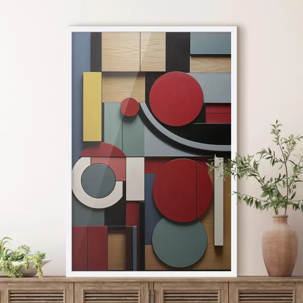 Plakatas Abstrakčioji geometrinė kompozicija su medžio tekstūros imitacija, raudonais, juodais, baltais ir žaliais stačiakampiais ir apskritimais f47876