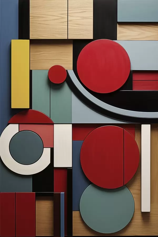 Plakatas Abstrakčioji geometrinė kompozicija su medžio tekstūros imitacija, raudonais, juodais, baltais ir žaliais stačiakampiais ir apskritimais Ne f47876