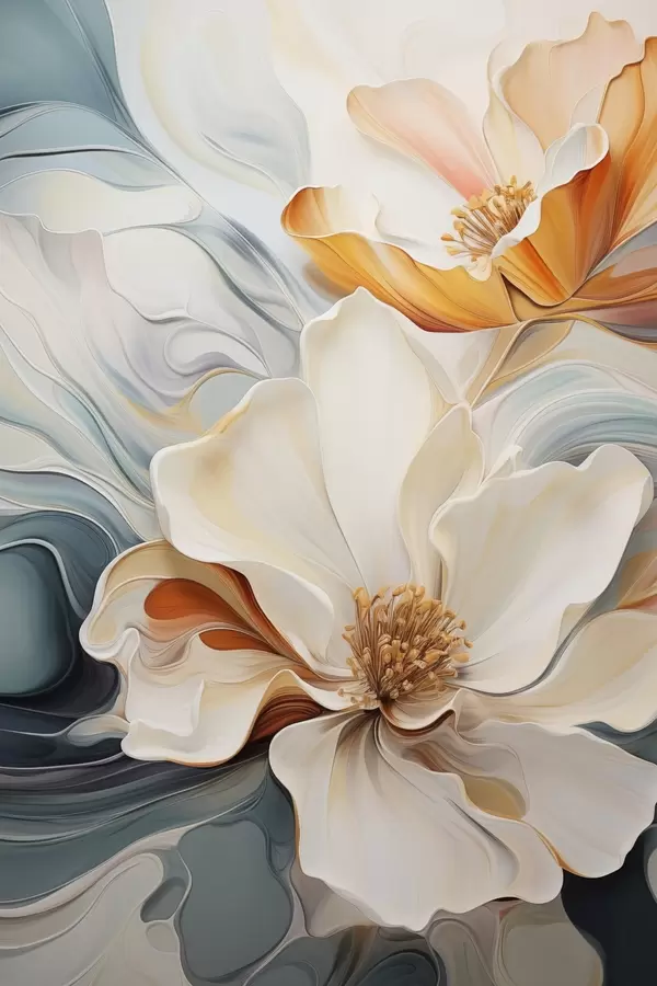 Plakatas Abstraktus didelis gėlė su baltais, oranžiniais ir žalios spalvos žiedlapiais, tekstūruotu fonu f47878