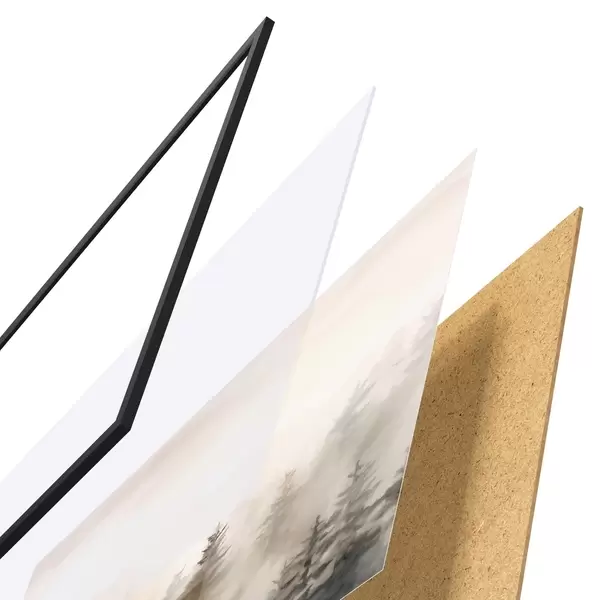 Plakatą sudaro rėmas, pleksiklas, atspausdintas vaizdas ir medžio drožlių plokštės pagrindas. Plakatą galima iš karto pakabinti ant sienos dėl kitoje pusėje esančių laikiklių.