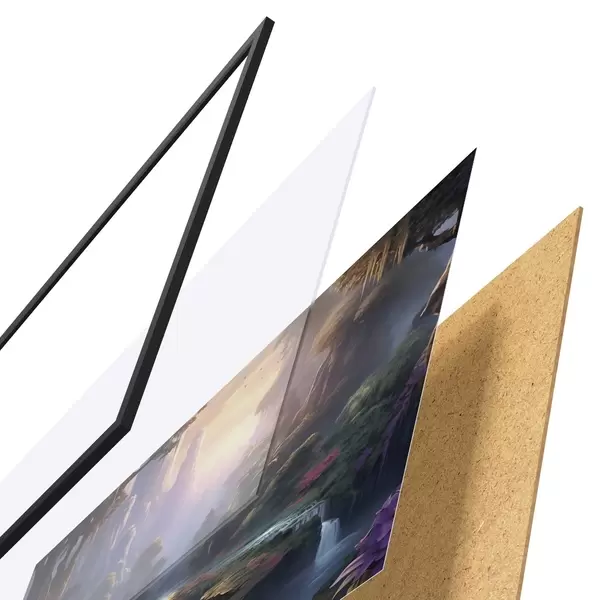 Plakatą sudaro rėmas, pleksiklas, atspausdintas vaizdas ir medžio drožlių plokštės pagrindas. Plakatą galima iš karto pakabinti ant sienos dėl kitoje pusėje esančių laikiklių.
