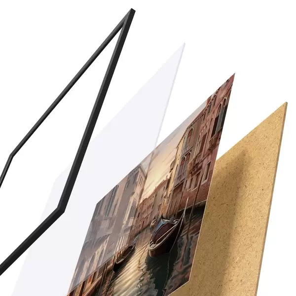 Plakatą sudaro rėmas, pleksiklas, atspausdintas vaizdas ir medžio drožlių plokštės pagrindas. Plakatą galima iš karto pakabinti ant sienos dėl kitoje pusėje esančių laikiklių.