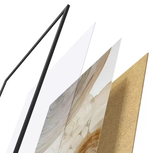 Plakatą sudaro rėmas, pleksiklas, atspausdintas vaizdas ir medžio drožlių plokštės pagrindas. Plakatą galima iš karto pakabinti ant sienos dėl kitoje pusėje esančių laikiklių.