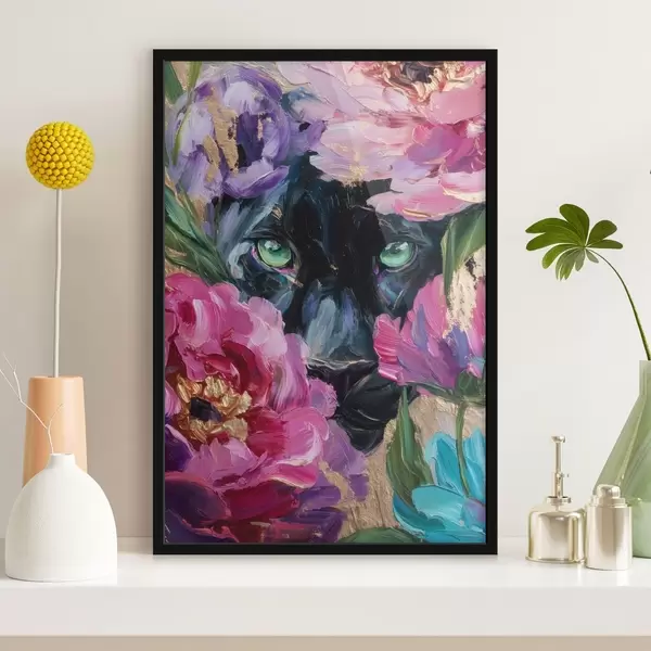 Plakatas juoda pantera žvilgteli iš tarp bijūnų f47936
