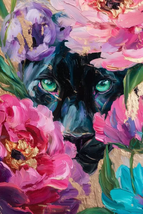Plakatas juoda pantera žvilgteli iš tarp bijūnų f47936