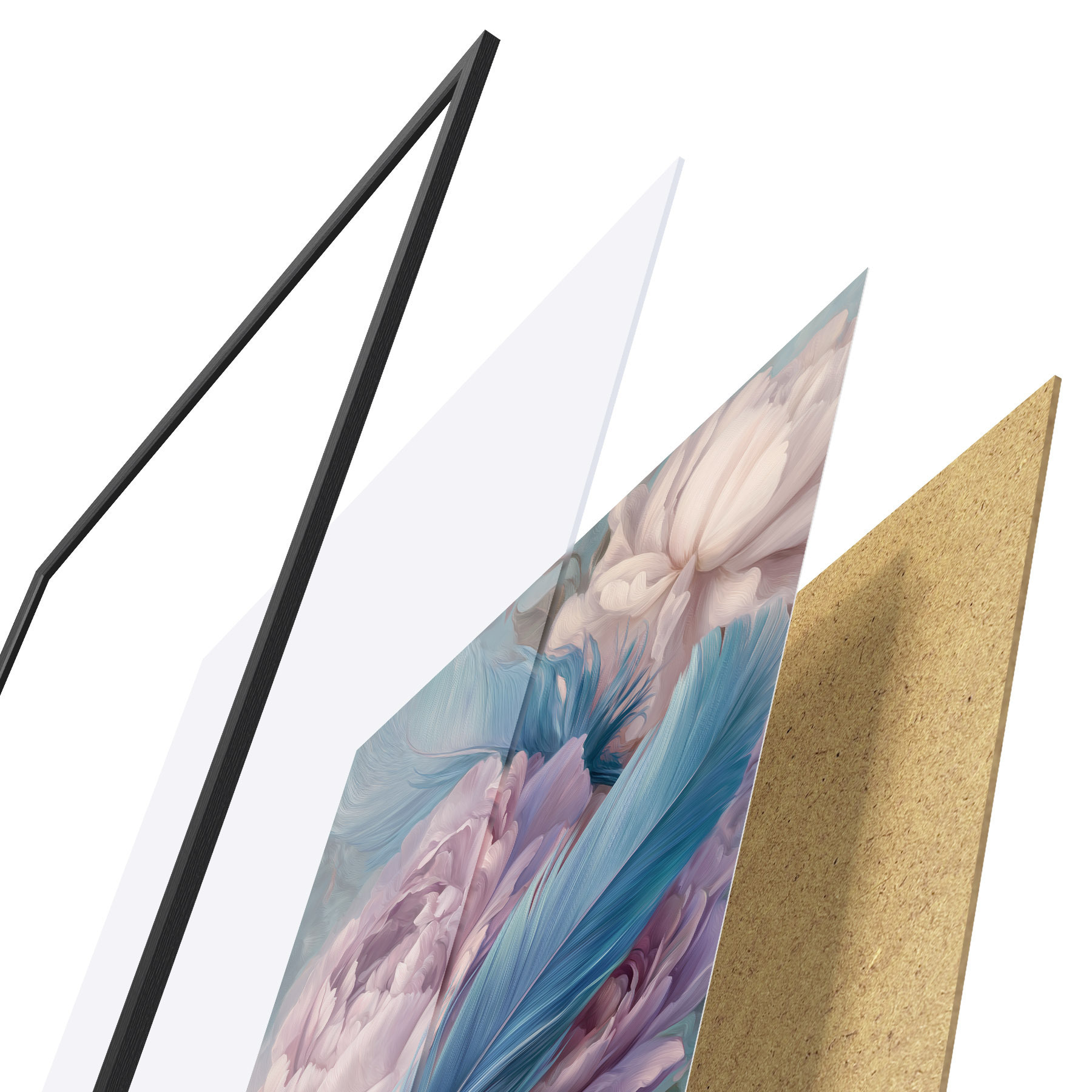 Plakatą sudaro rėmas, pleksiklas, atspausdintas vaizdas ir medžio drožlių plokštės pagrindas. Plakatą galima iš karto pakabinti ant sienos dėl kitoje pusėje esančių laikiklių.