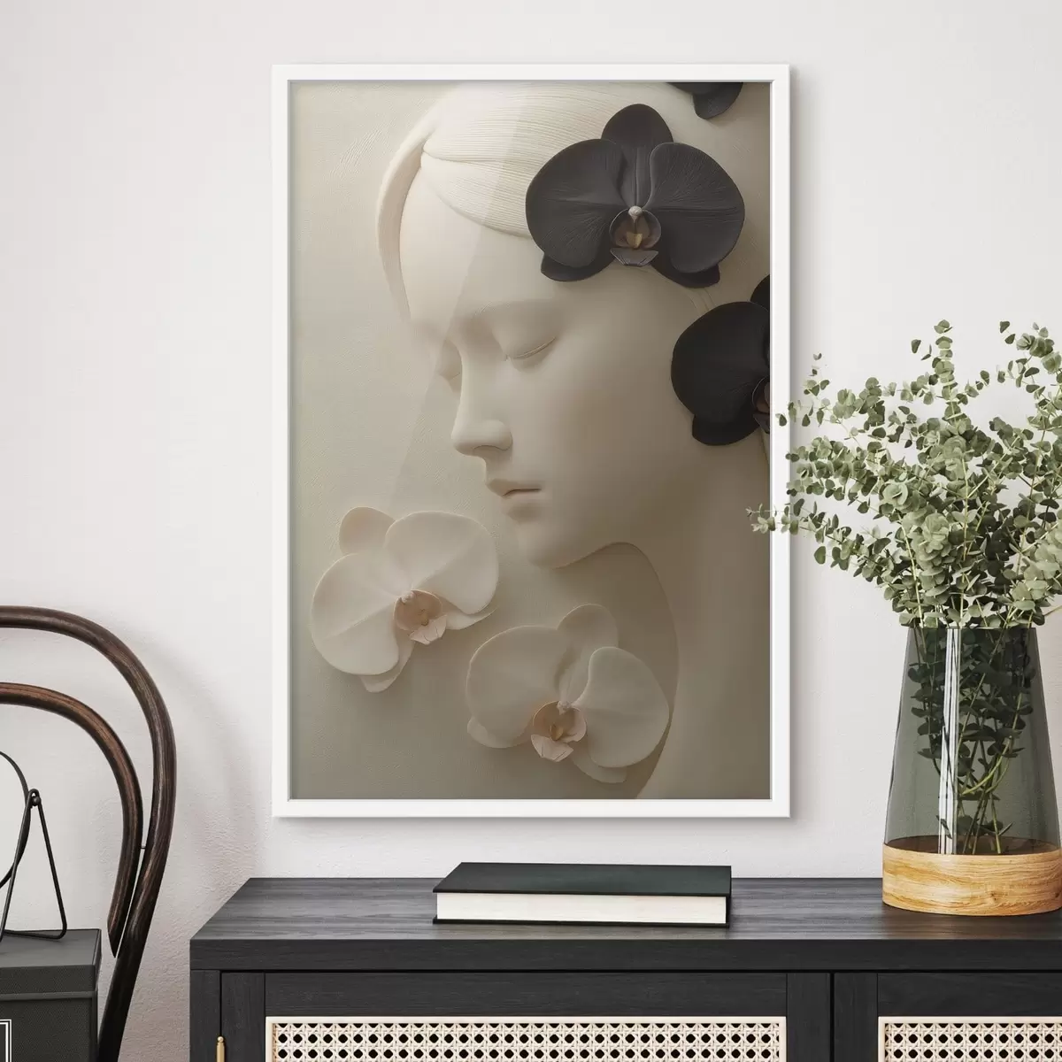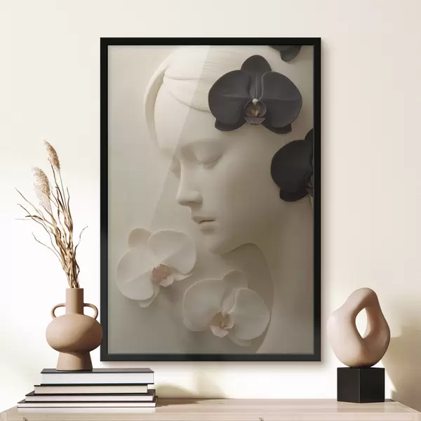 Plakatas mergina su orchidėjomis, išraižyta bareljefo stiliumi Ne f47942
