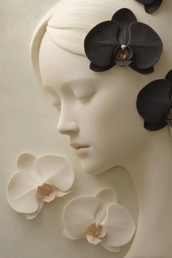 Plakatas mergina su orchidėjomis, išraižyta bareljefo stiliumi f47942