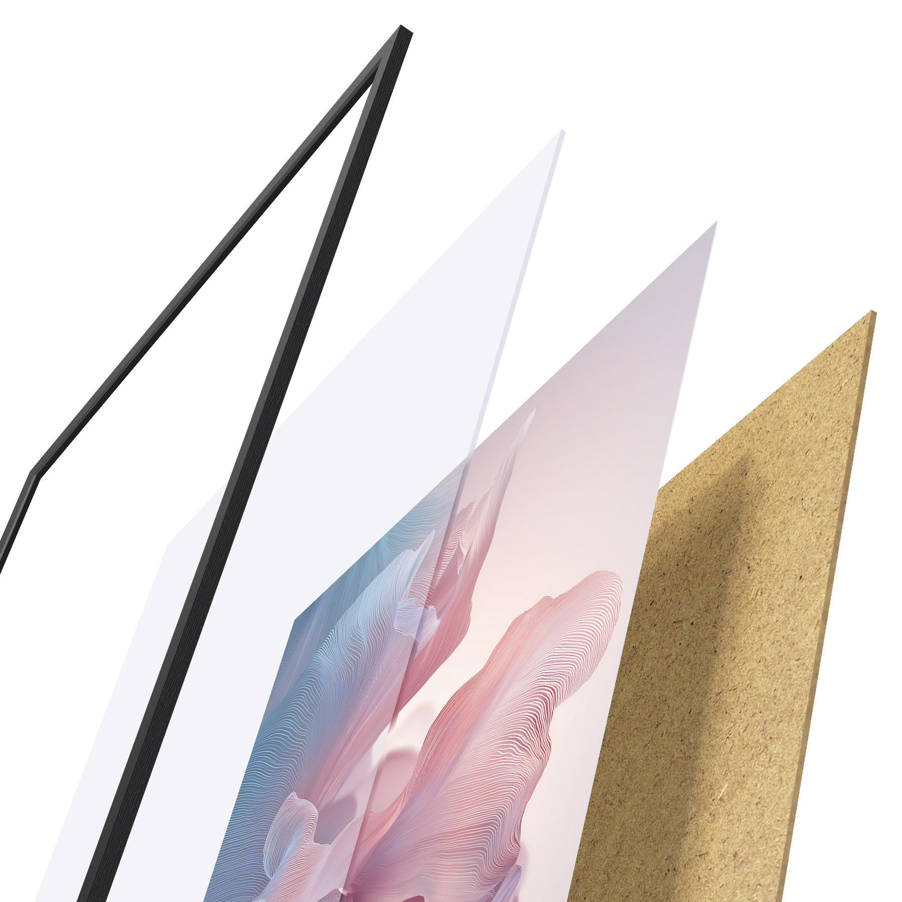 Plakatą sudaro rėmas, pleksiklas, atspausdintas vaizdas ir medžio drožlių plokštės pagrindas. Plakatą galima iš karto pakabinti ant sienos dėl kitoje pusėje esančių laikiklių.
