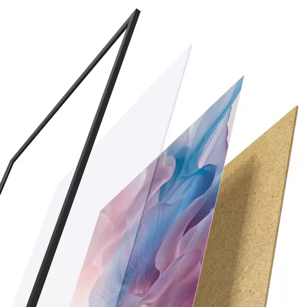 Plakatą sudaro rėmas, pleksiklas, atspausdintas vaizdas ir medžio drožlių plokštės pagrindas. Plakatą galima iš karto pakabinti ant sienos dėl kitoje pusėje esančių laikiklių.