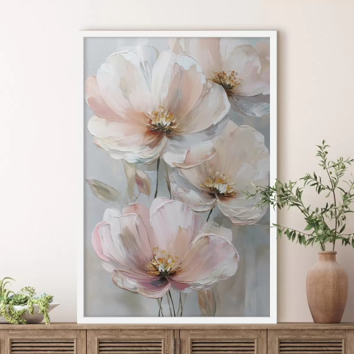 Plakatas Balto-rožinės spalvos gėlės su išraiškingais potėpiais aliejaus tapybos stiliumi f47962