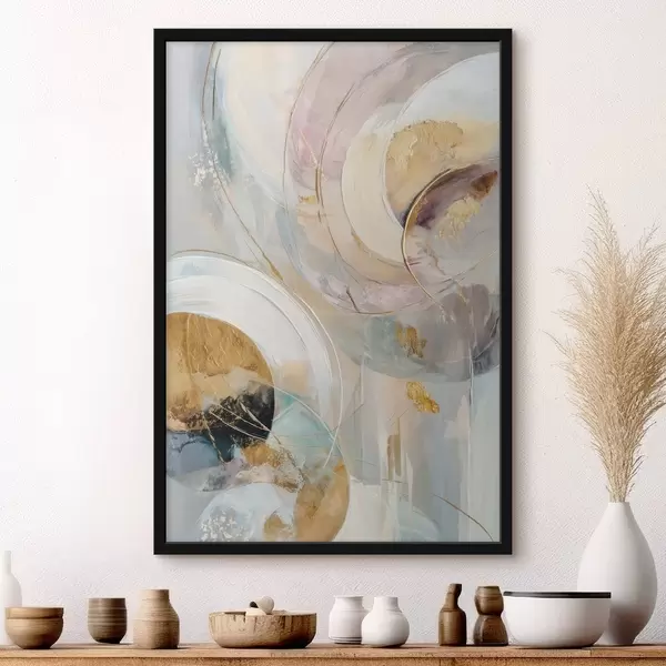 Plakatas Kompozicija su sluoksniais išdėstytais apskritimais elementais ir dažų potėpiais f47983