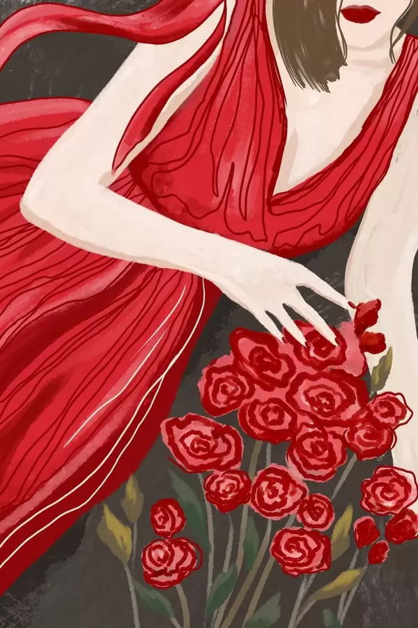 Plakatas Moteris raudona suknele su rožių puokšte f48026