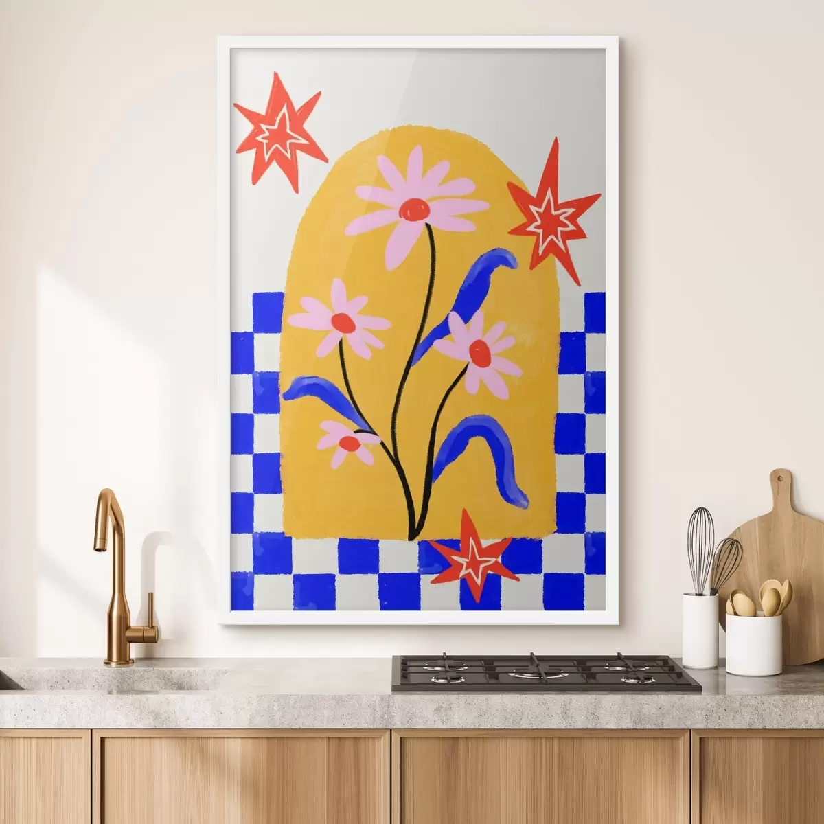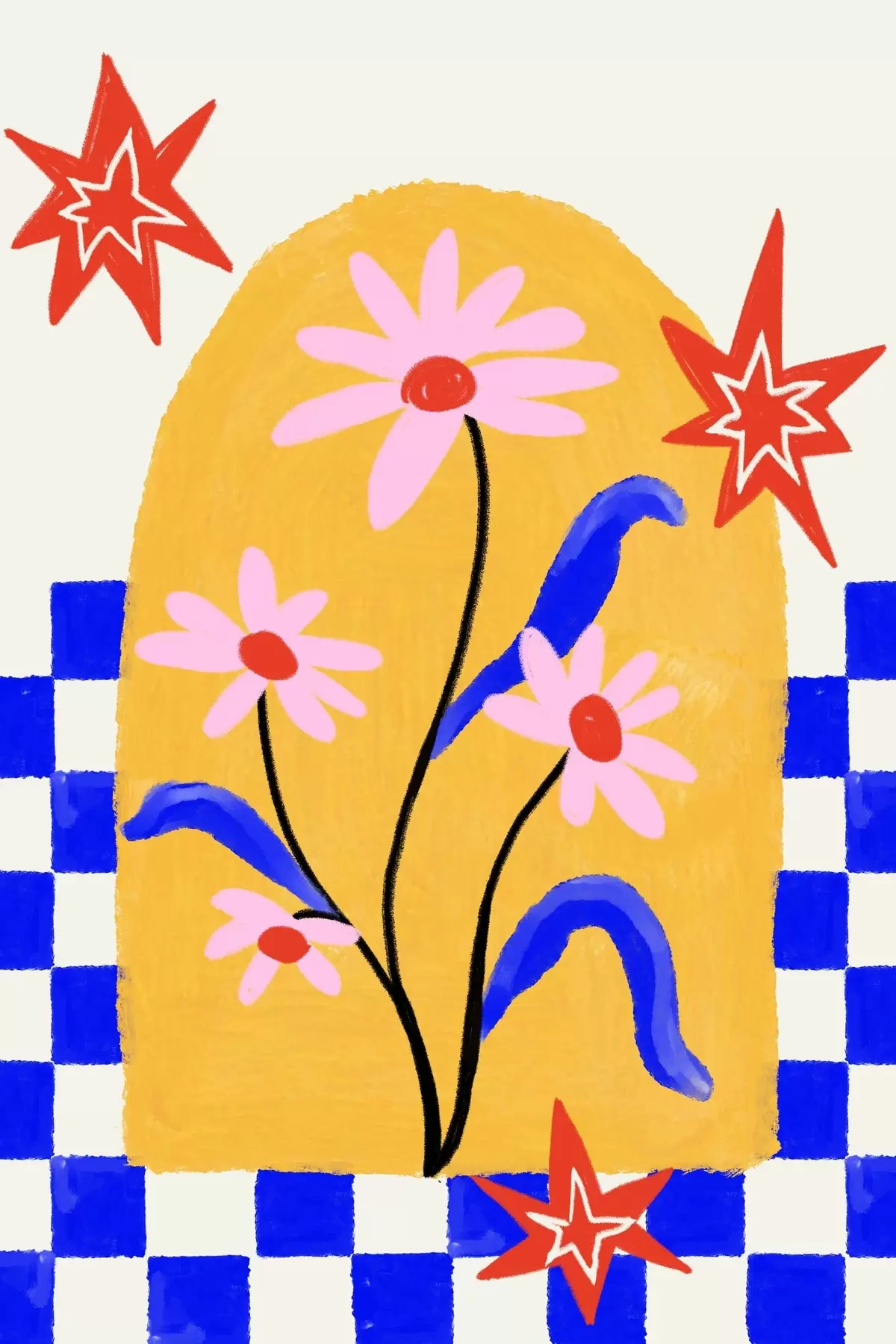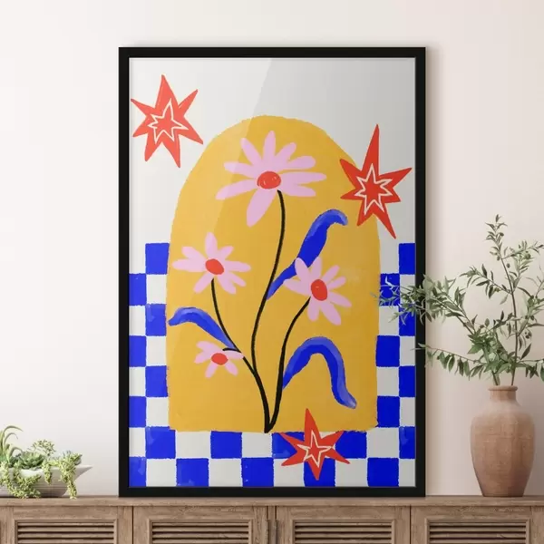 Plakatas Ryškios gėlės ant geltono fono su mėlynu raštu f48034