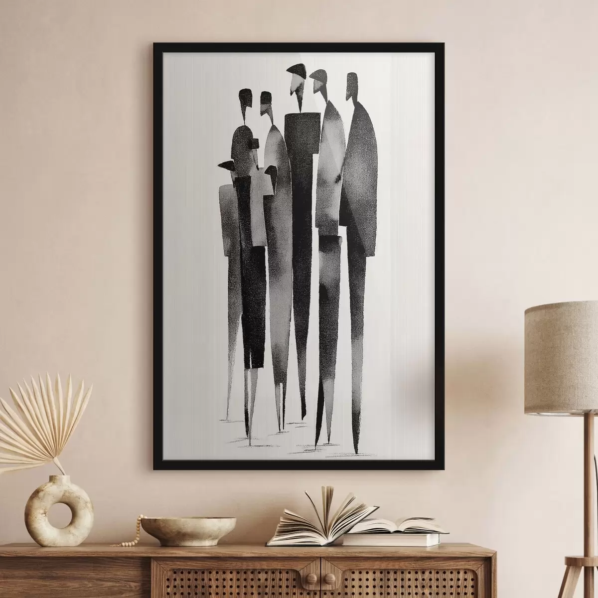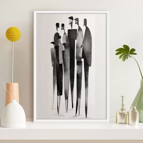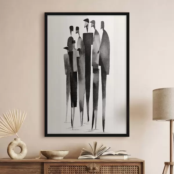 Plakatas minimalistinės pailgos žmogaus figūros, stovinčios eilėje f48068