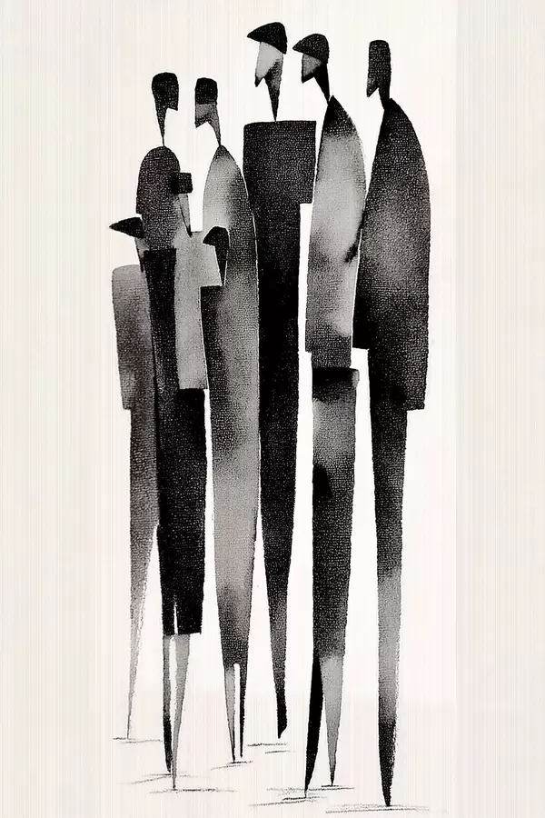 Plakatas minimalistinės pailgos žmogaus figūros, stovinčios eilėje f48068