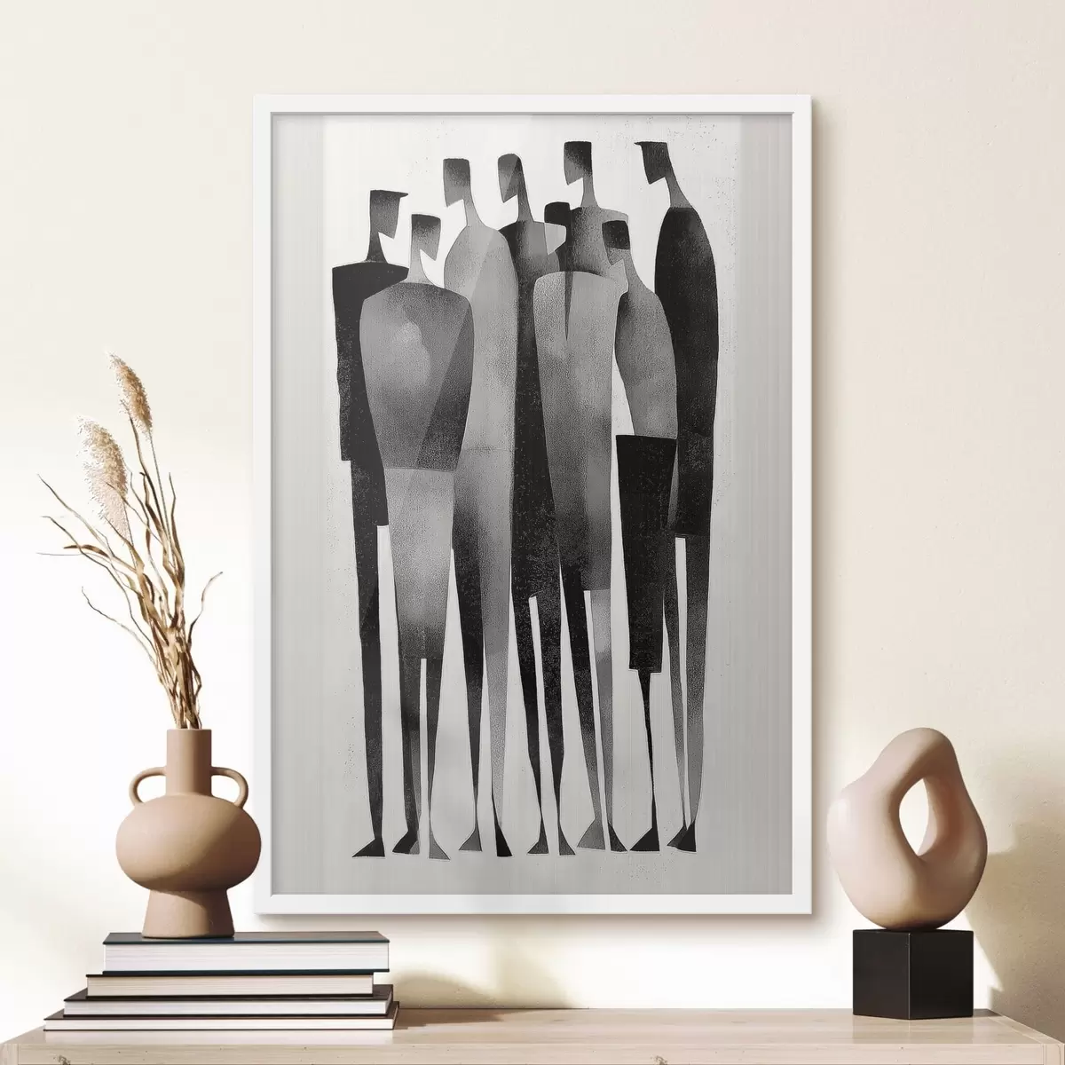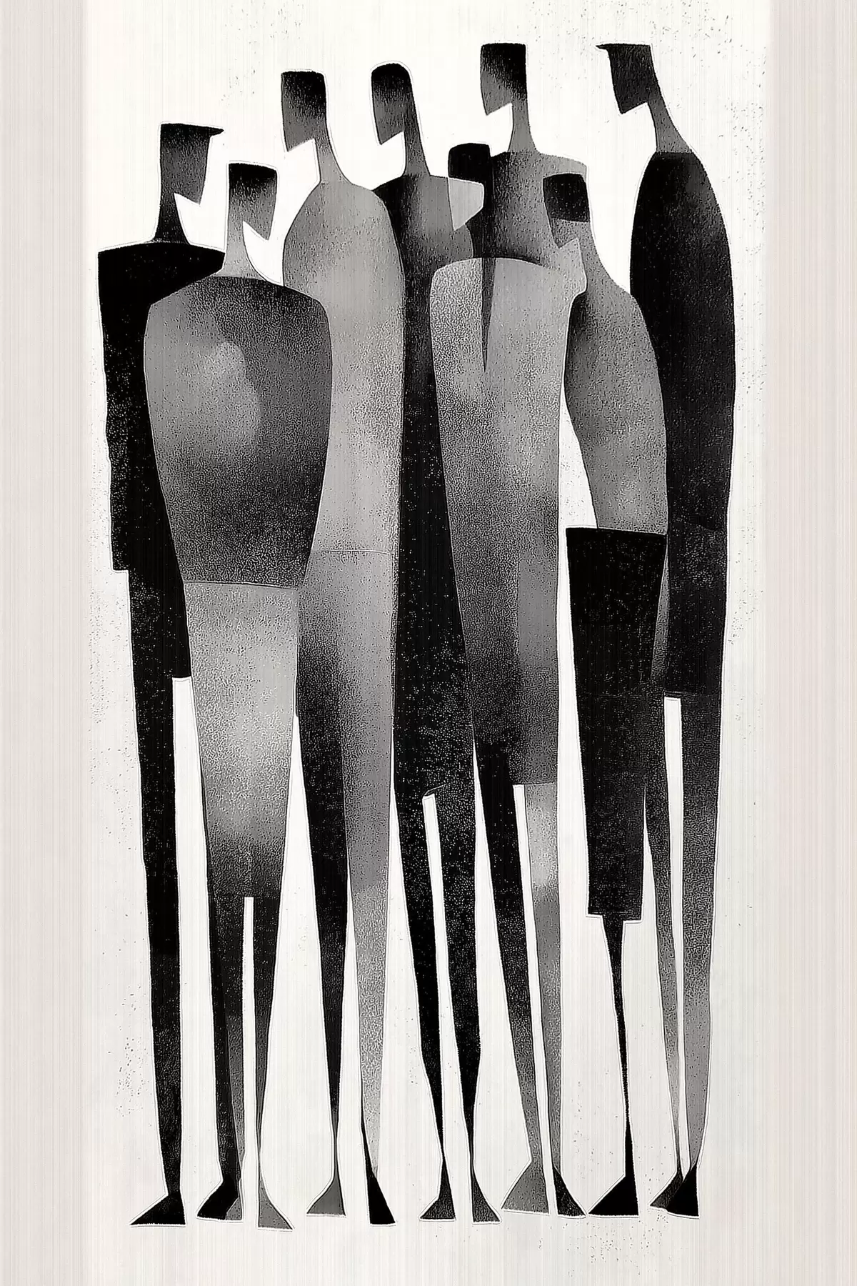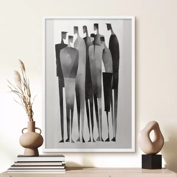 Plakatas minimalistinės pailgos žmogaus figūros, stovinčios eilėje f48069