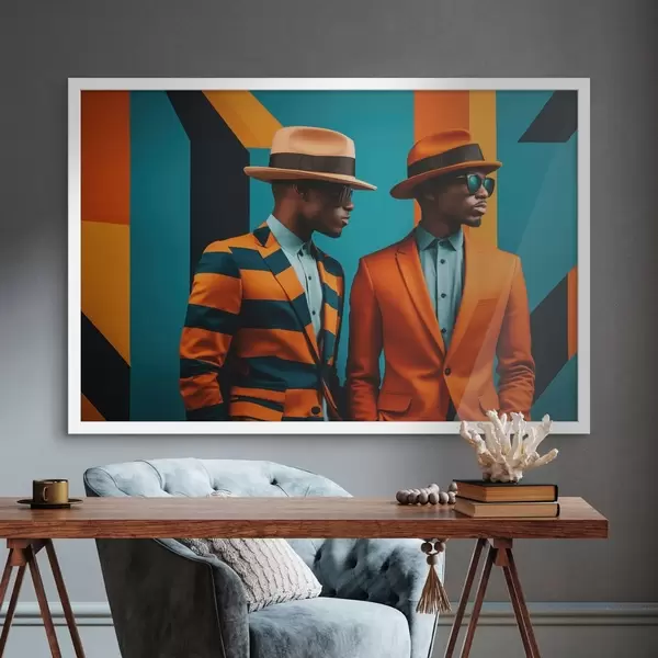 Plakatas Du vyrai ryškiais kostiumais ir skrybėlėmis f48091
