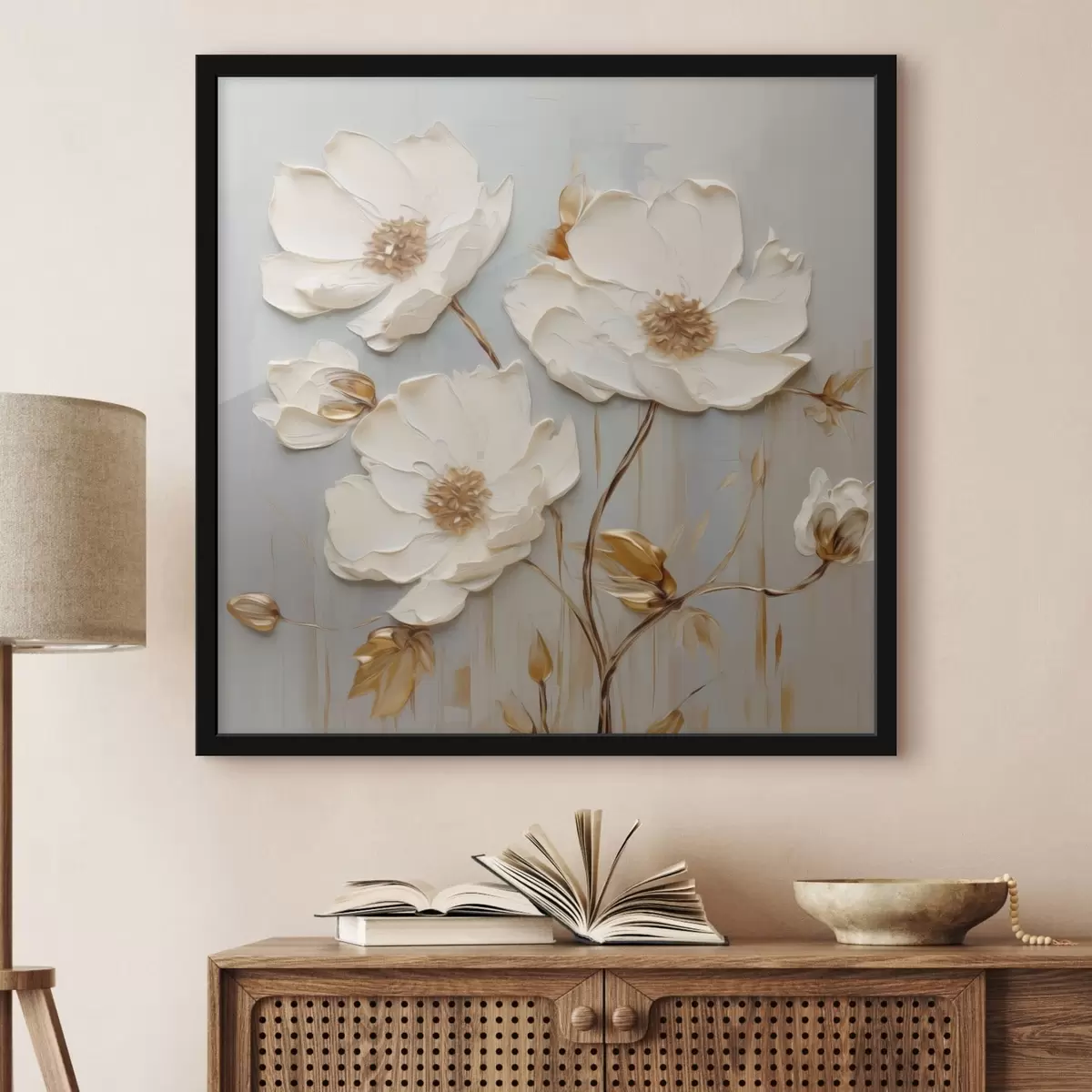 Plakatas Reljefiniai balti žiedai su šiltais lapais f48093