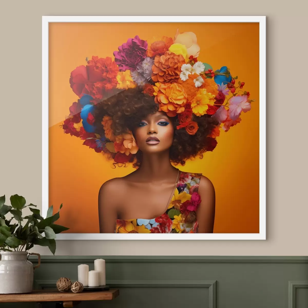 Plakatas Moteris su gėlių vainiku ant oranžinio fono Ne f48102