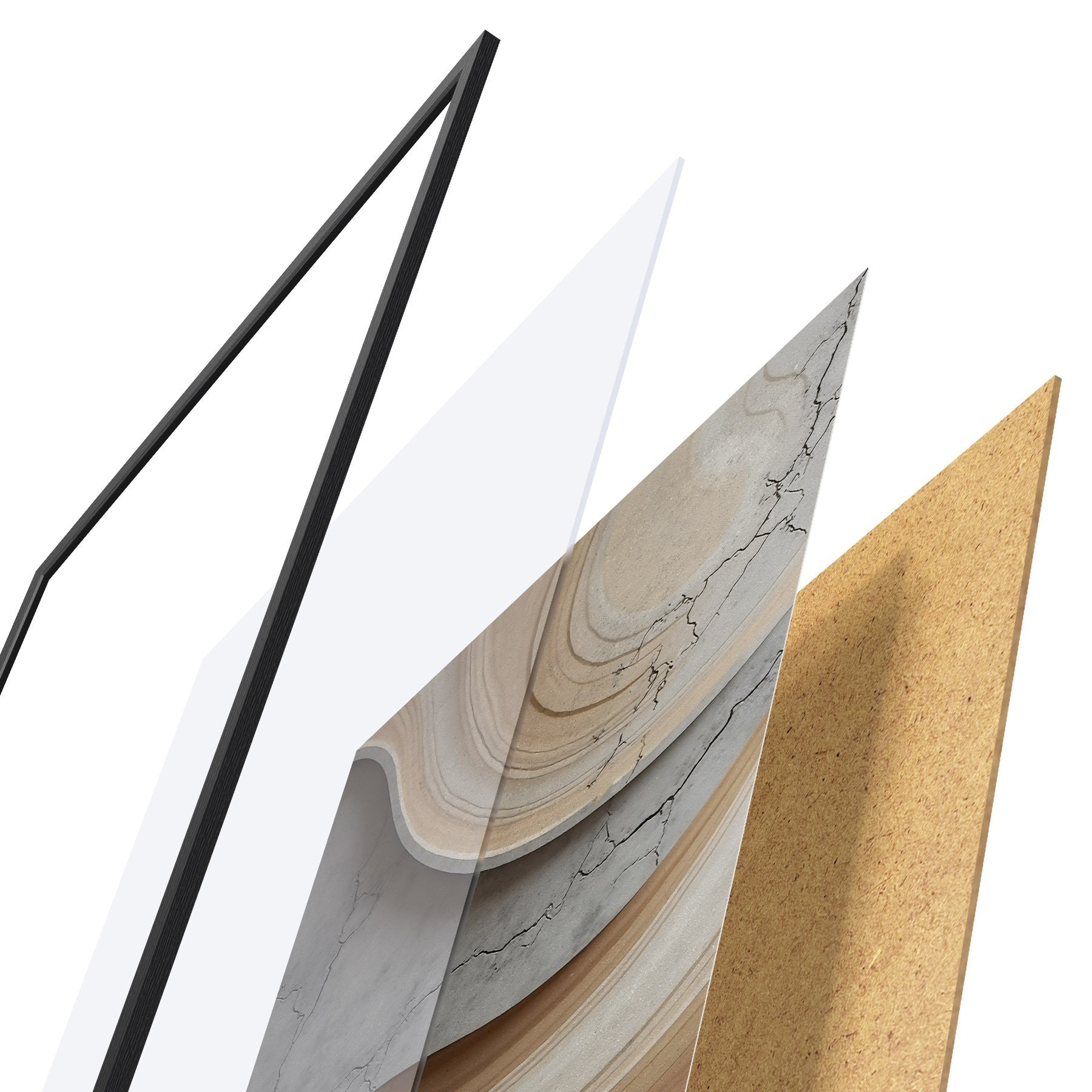 Plakatą sudaro rėmas, pleksiklas, atspausdintas vaizdas ir medžio drožlių plokštės pagrindas. Plakatą galima iš karto pakabinti ant sienos dėl kitoje pusėje esančių laikiklių.
