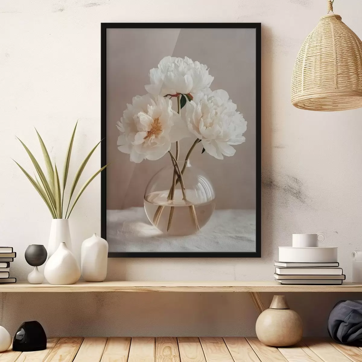 Plakatas vėjuotas minimalistinis natiurmortas su pionijomis Ne f48119
