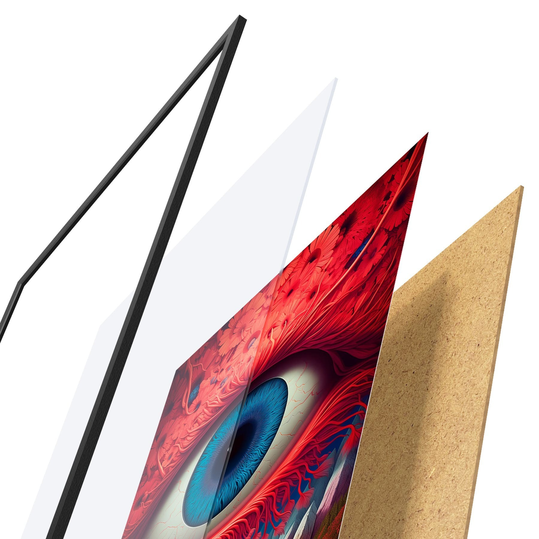 Plakatą sudaro rėmas, pleksiklas, atspausdintas vaizdas ir medžio drožlių plokštės pagrindas. Plakatą galima iš karto pakabinti ant sienos dėl kitoje pusėje esančių laikiklių.