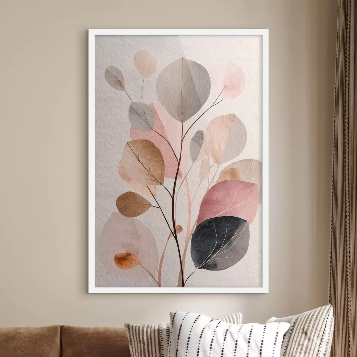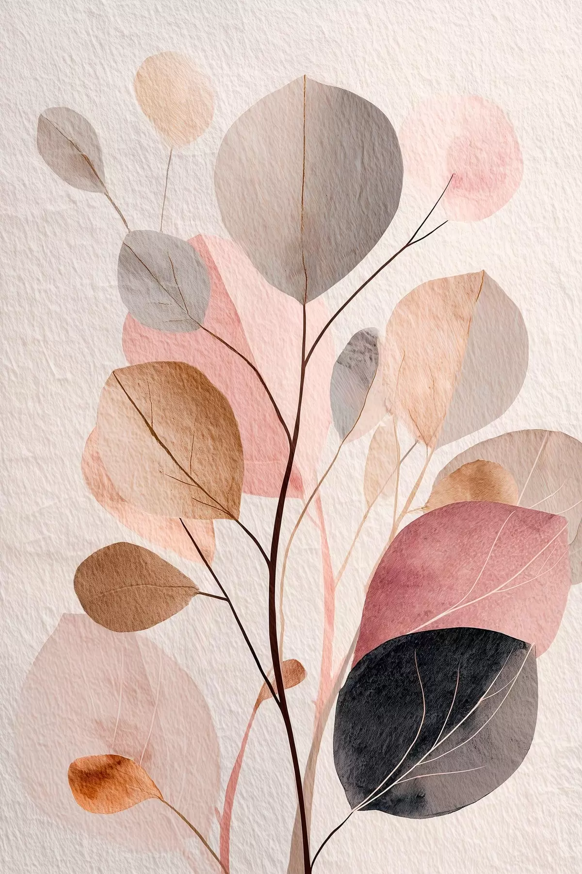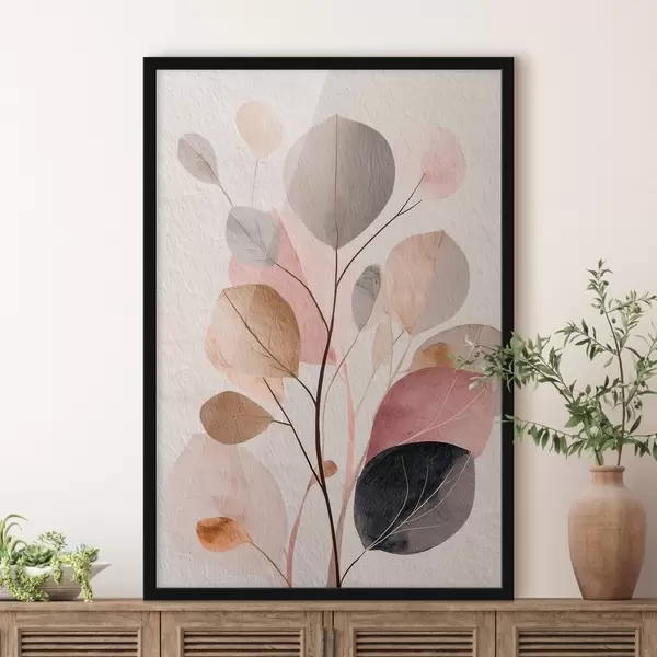 Plakatas Abstrakti šaka su apvaliais lapais šiltų smėlio ir koralų atspalvių f48187