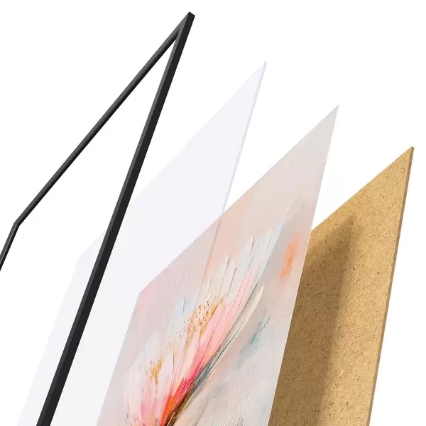 Plakatą sudaro rėmas, pleksiklas, atspausdintas vaizdas ir medžio drožlių plokštės pagrindas. Plakatą galima iš karto pakabinti ant sienos dėl kitoje pusėje esančių laikiklių.