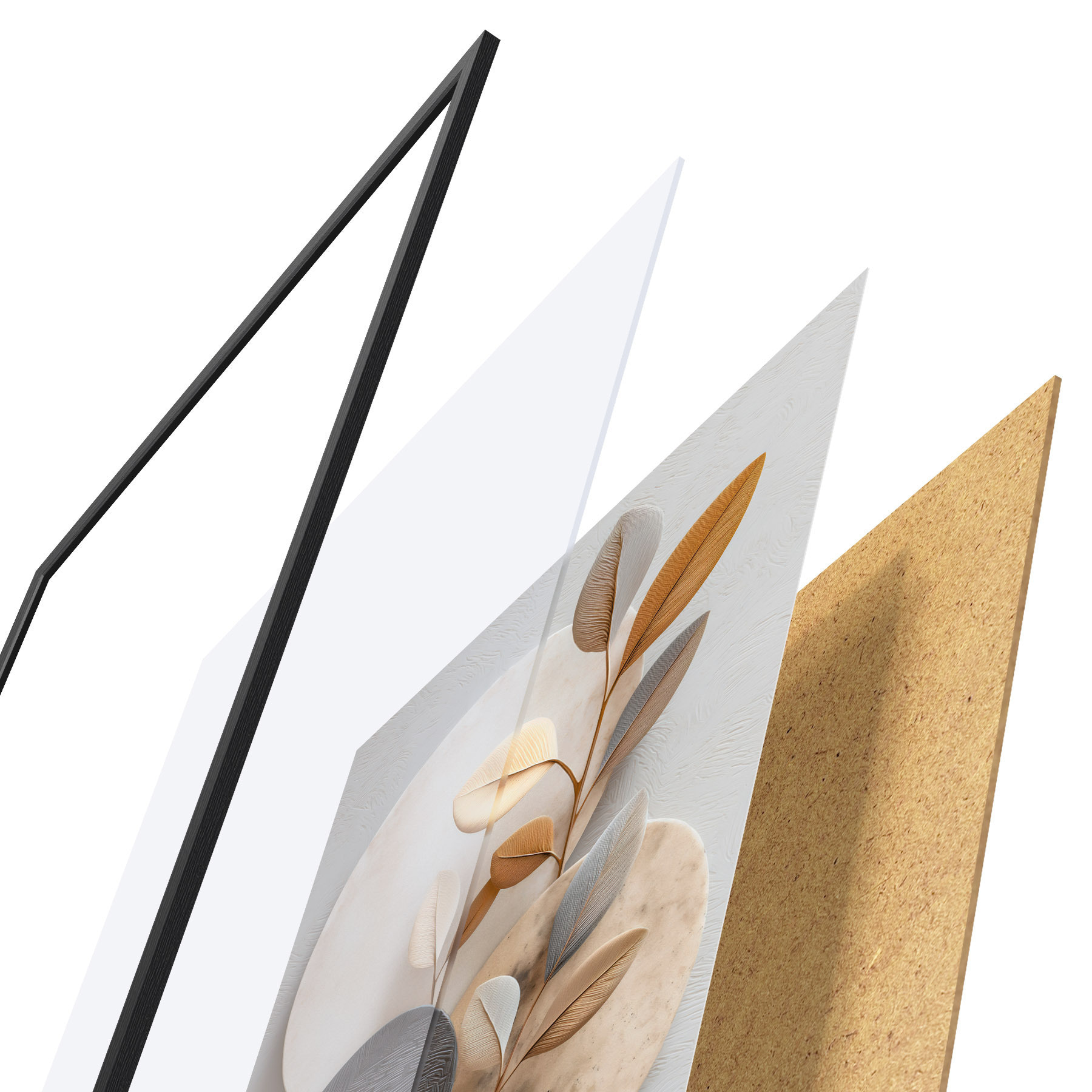 Plakatą sudaro rėmas, pleksiklas, atspausdintas vaizdas ir medžio drožlių plokštės pagrindas. Plakatą galima iš karto pakabinti ant sienos dėl kitoje pusėje esančių laikiklių.
