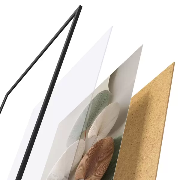 Plakatą sudaro rėmas, pleksiklas, atspausdintas vaizdas ir medžio drožlių plokštės pagrindas. Plakatą galima iš karto pakabinti ant sienos dėl kitoje pusėje esančių laikiklių.