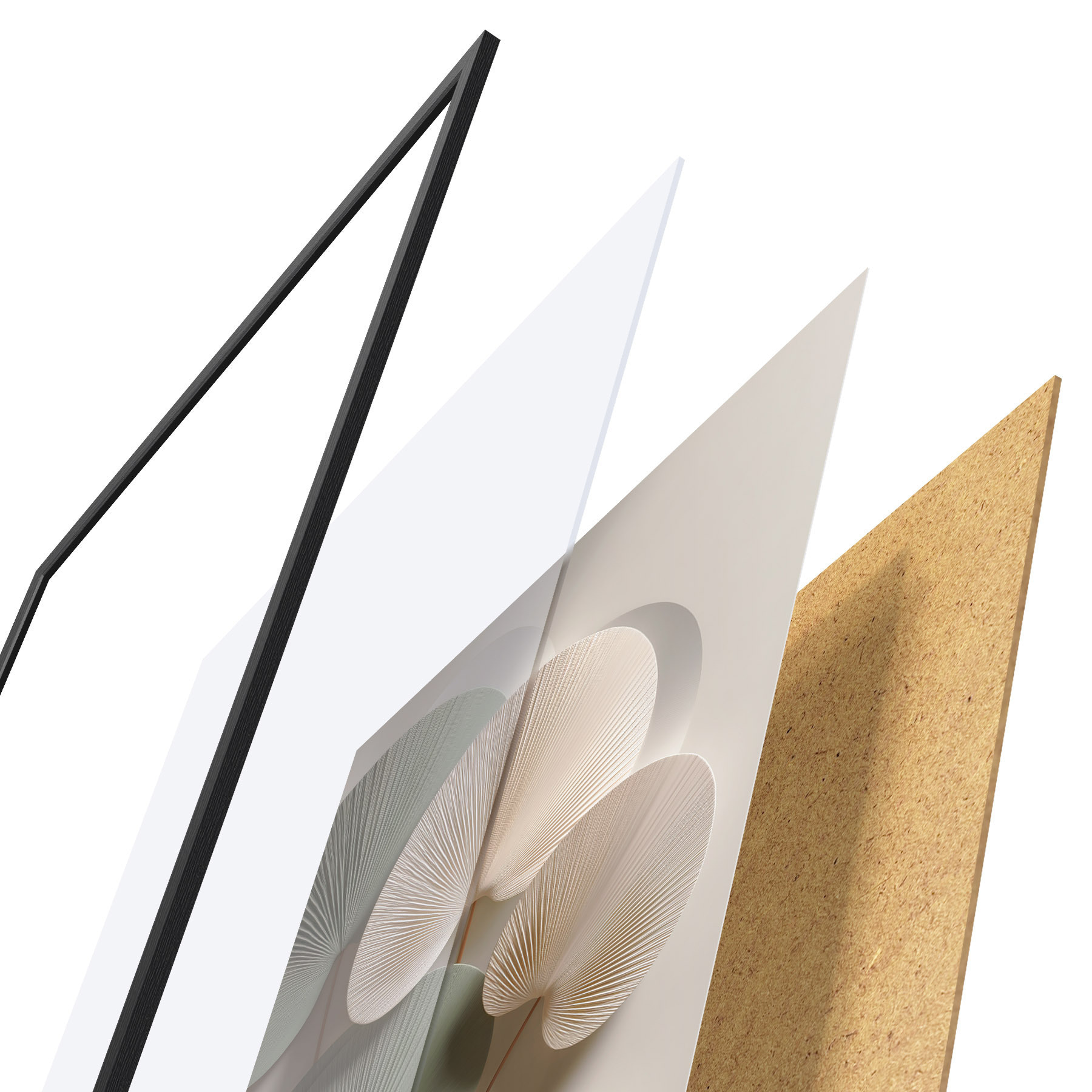 Plakatą sudaro rėmas, pleksiklas, atspausdintas vaizdas ir medžio drožlių plokštės pagrindas. Plakatą galima iš karto pakabinti ant sienos dėl kitoje pusėje esančių laikiklių.