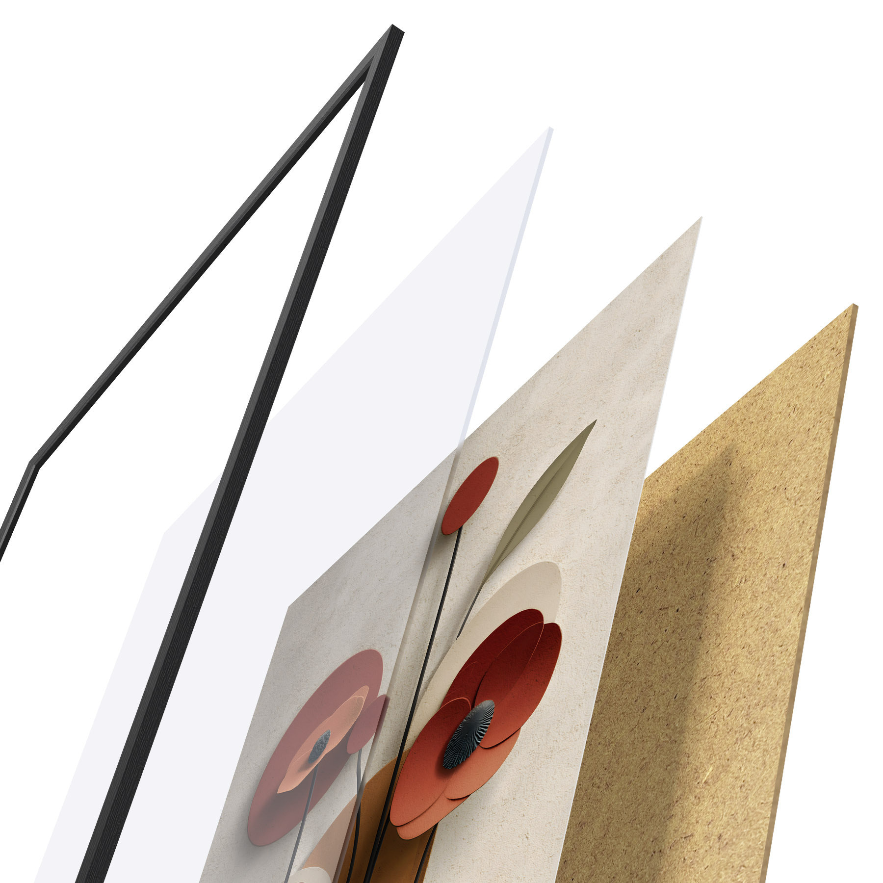 Plakatą sudaro rėmas, pleksiklas, atspausdintas vaizdas ir medžio drožlių plokštės pagrindas. Plakatą galima iš karto pakabinti ant sienos dėl kitoje pusėje esančių laikiklių.
